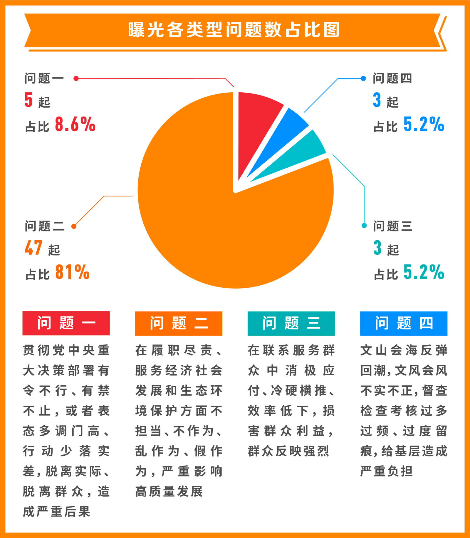從具體問(wèn)題類型看,“貫徹黨中央重大決策部署有令不行、有禁不止,或者表態(tài)多調(diào)門高、行動(dòng)少落實(shí)差,脫離實(shí)際、脫離群眾,造成嚴(yán)重后果”方面問(wèn)題5起,占比8.6%;“在履職盡責(zé)、服務(wù)經(jīng)濟(jì)社會(huì)發(fā)展和生態(tài)環(huán)境保護(hù)方面不擔(dān)當(dāng)、不作為、亂作為、假作為,嚴(yán)重影響高質(zhì)量發(fā)展”方面問(wèn)題47起,占比81%;“在聯(lián)系服務(wù)群眾中消極應(yīng)付、冷硬橫推、效率低下,損害群眾利益,群眾反映強(qiáng)烈”方面問(wèn)題3起,占比5.2%;“文山會(huì)海反彈回潮,文風(fēng)會(huì)風(fēng)不實(shí)不正,督查檢查考核過(guò)多過(guò)頻、過(guò)度留痕,給基層造成嚴(yán)重負(fù)擔(dān)”方面問(wèn)題3起,占比5.2%。