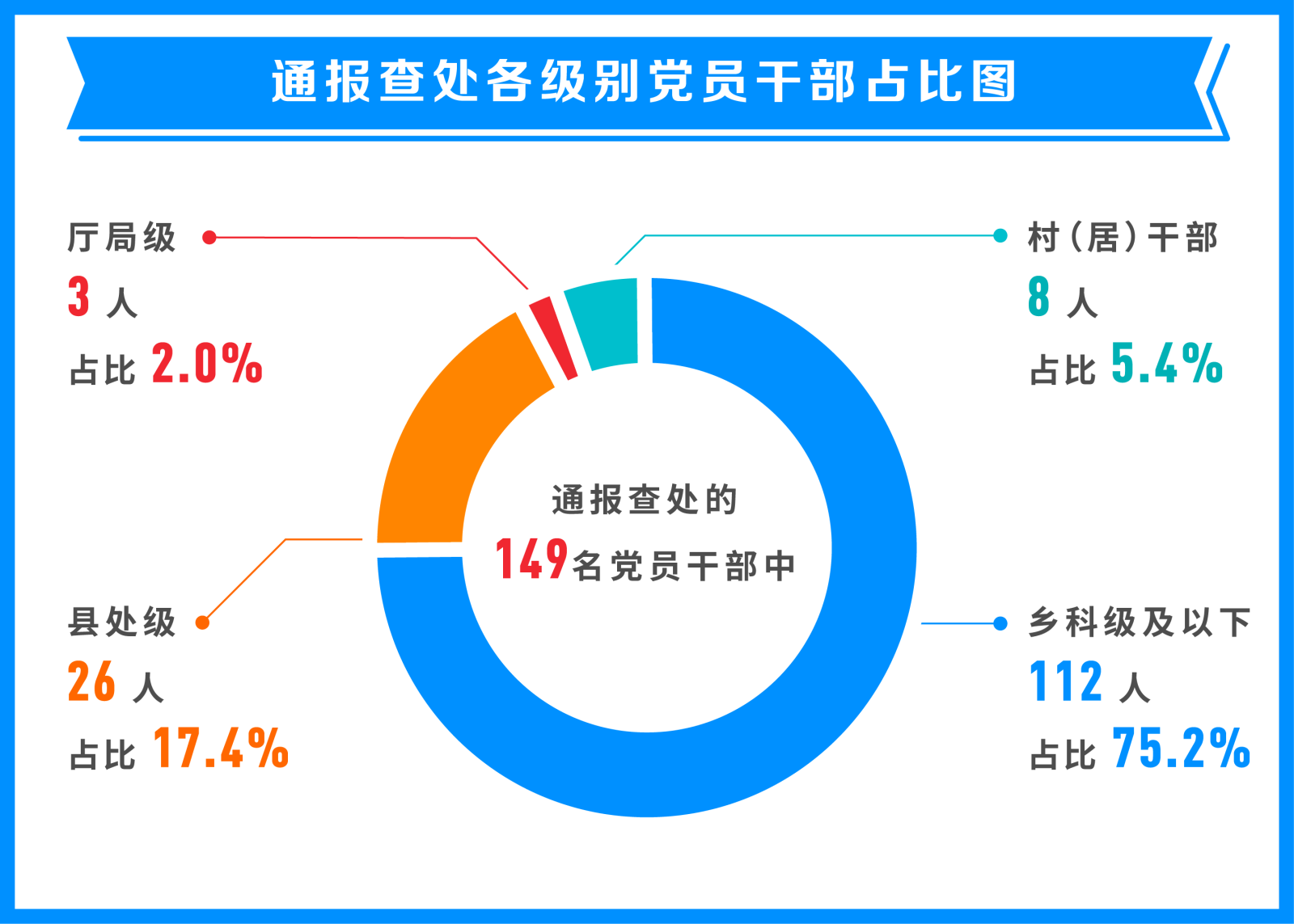 從處理各級(jí)別黨員干部人數(shù)看,通報(bào)的58起典型問(wèn)題,查處的149名黨員干部中,村(居)干部8人,占全部人數(shù)5.4%;鄉(xiāng)科級(jí)及以下112人,占全部人數(shù)75.2%;縣處級(jí)26人,占全部人數(shù)17.4%;地廳級(jí)3人,占全部人數(shù)2.0%。通報(bào)數(shù)據(jù)印證,重點(diǎn)整治群眾身邊特別是群眾反映強(qiáng)烈的形式主義、官僚主義突出問(wèn)題十分必要。
